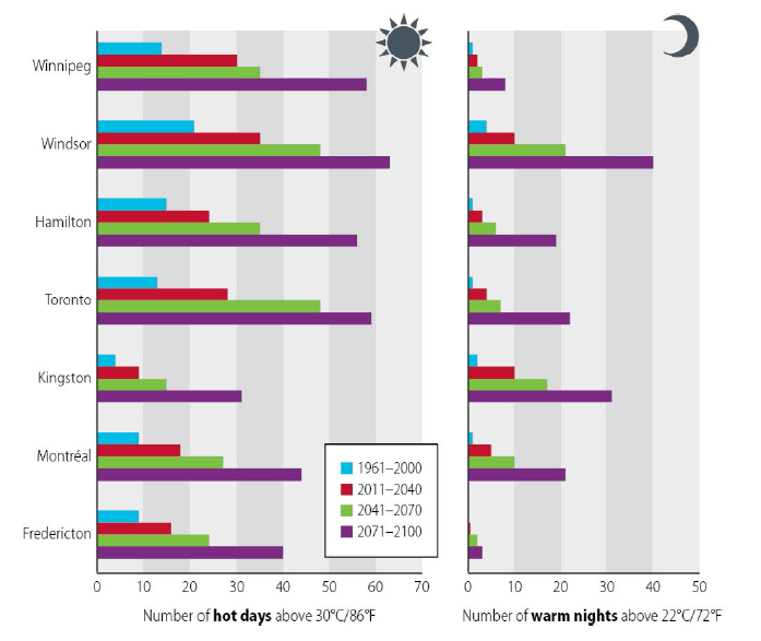 下图突出显示了加拿大城市当前和预计超过 30 摄氏度的天数。您可以看到图中确定的每个加拿大城市的炎热天数呈增加趋势。预计到 2021 年至 2040 年,最高气温达到 30°C 的天数将增加一倍,到 2081 年至 2100 年将增加两倍以上,这可能导致与高温相关的死亡率进一步上升。总体而言,加拿大预计将变得更加温暖,并且由于城市热岛效应,城市地区往往会经历更高的气温。