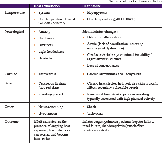 了解热衰竭与中暑的体征和症状: