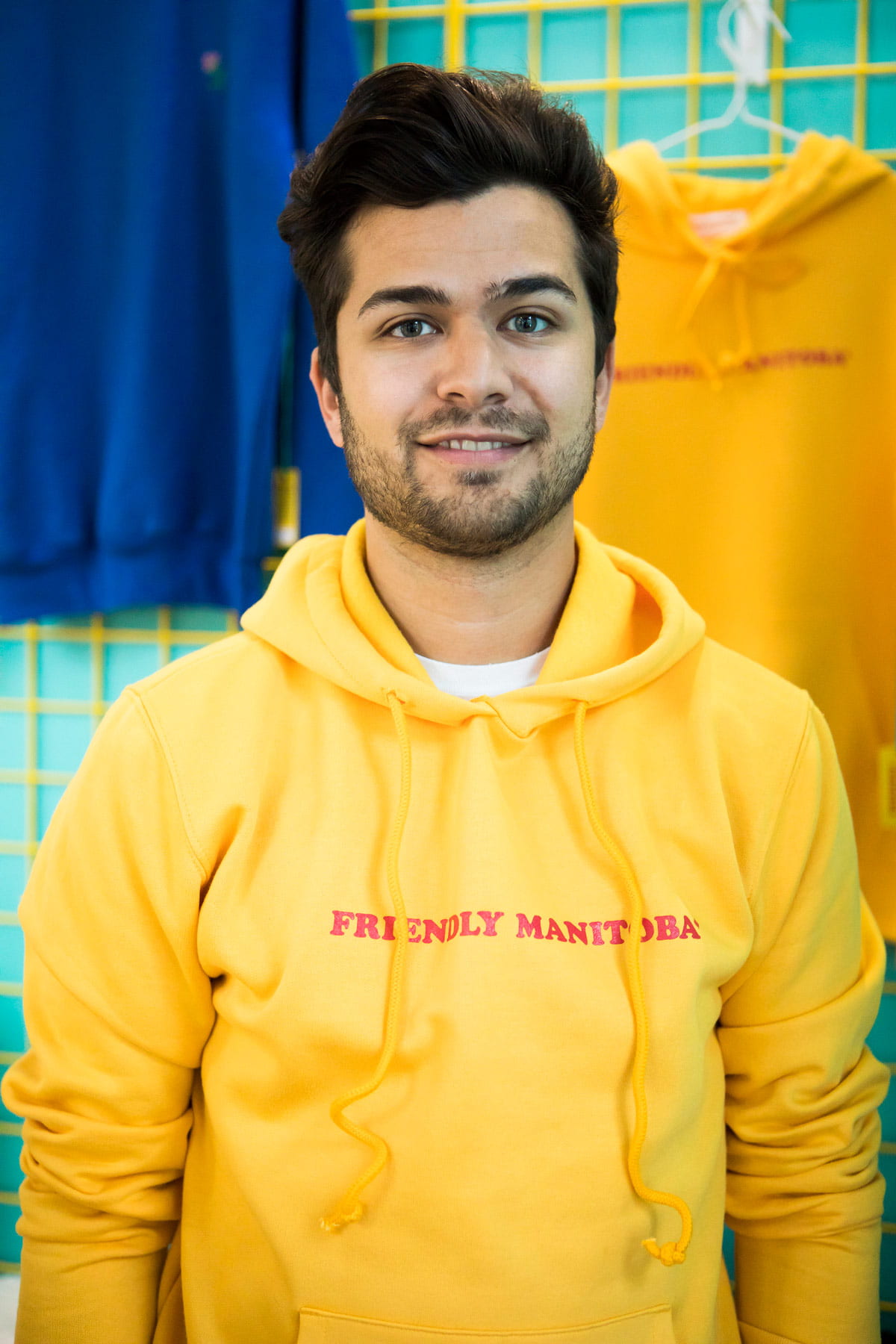 Doucette 毕业后不久,他推出了,这是他表达艺术自由的标签。但他说,他真正开始将自己在 RRC 培养的商业技能运用到“友好曼尼托巴”的推出中,该公司拥有更鲜明的品牌和一个可识别的名字——如果不是令人难忘的话。他的标志性作品——金色套头连帽衫——很难错过。