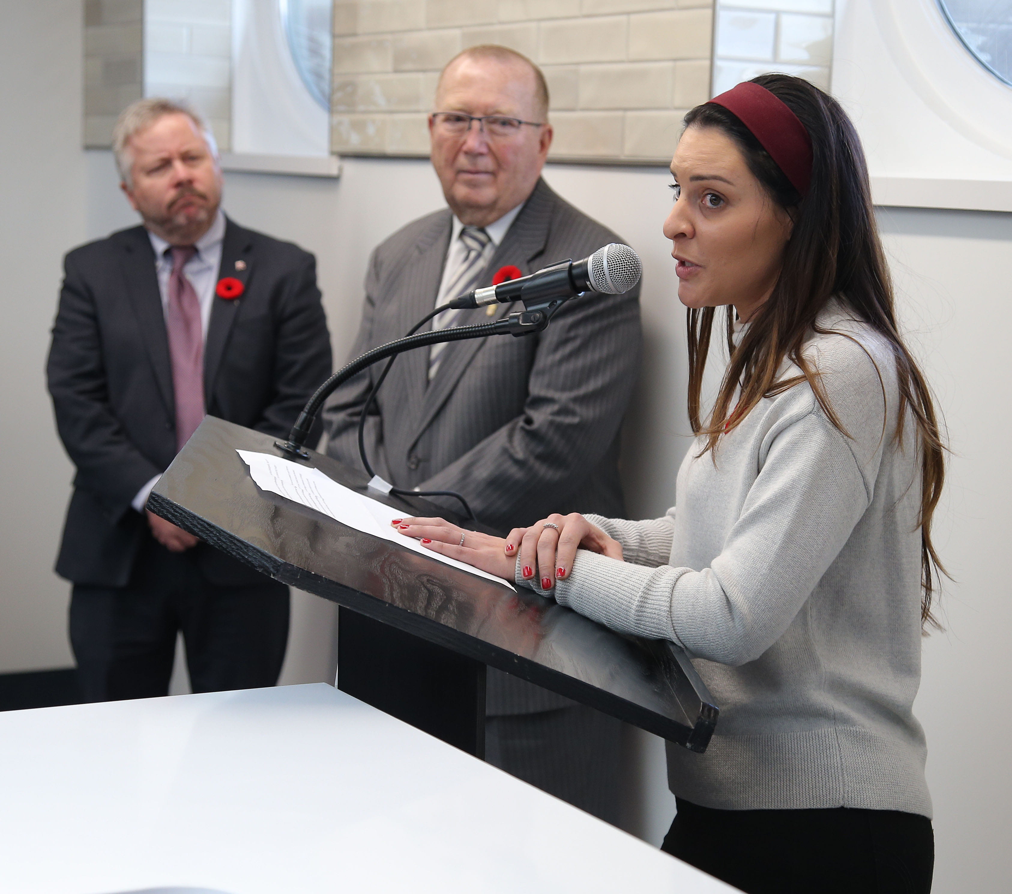 海莉·杰弗里斯 (Hailey Jefferies) 在草原研究厨房的盛大开幕式上发表讲话,RRC 临时主席达林·布莱希特 (Darin Brecht) 和经济发展与培训部长拉尔夫·艾希勒 (Ralph Eichler) 在一旁观看。
