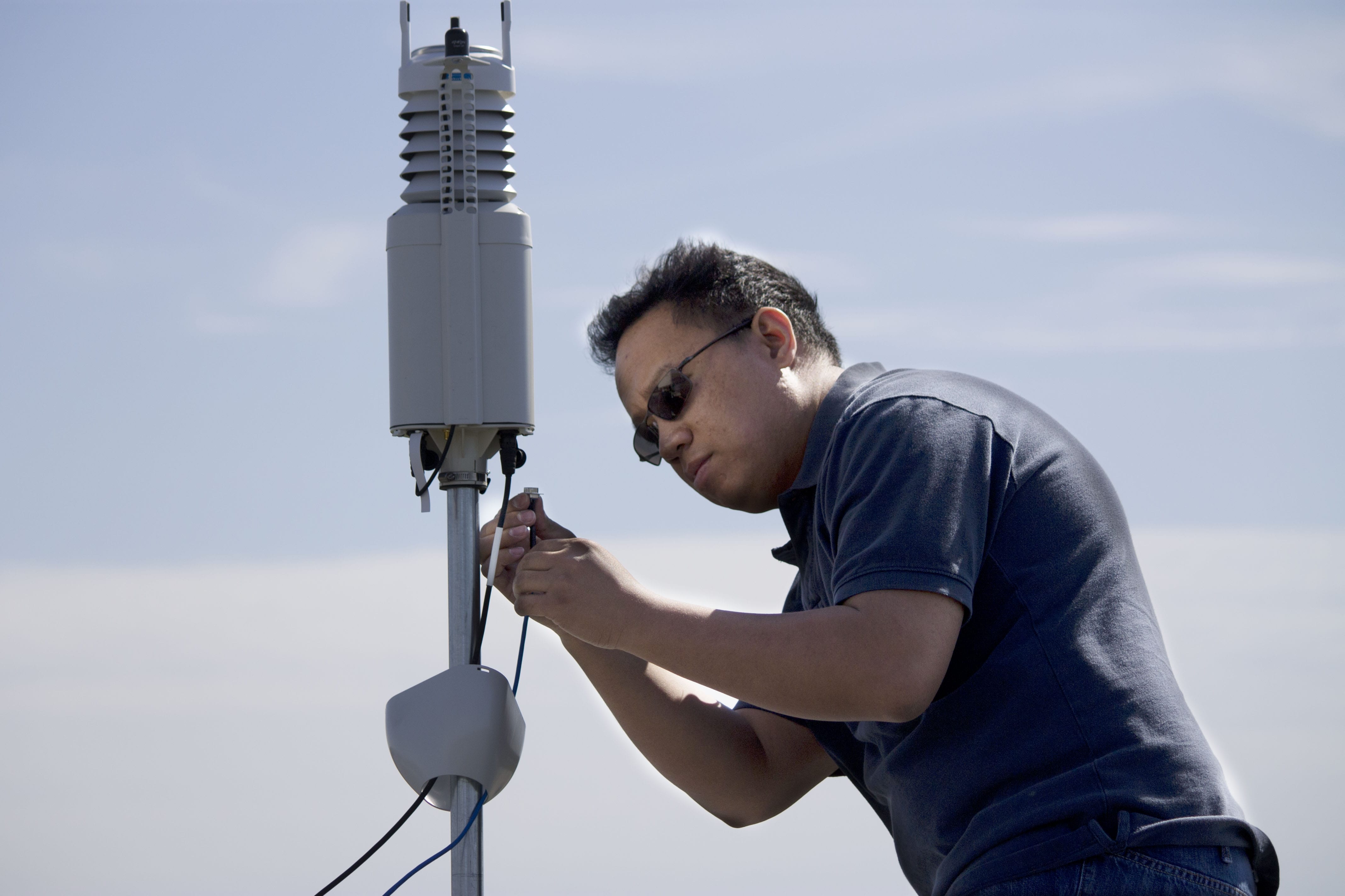 - e8体育 研究员 Jose Delos Reyes 在屋顶安装气象站。