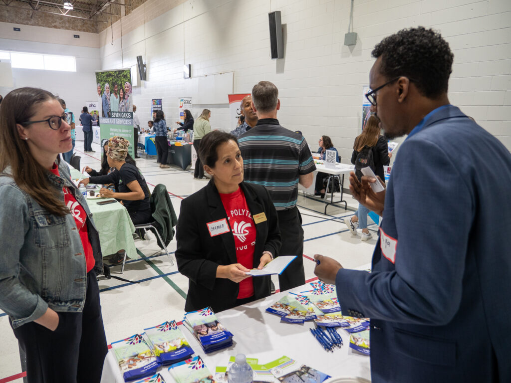 While many activities happen on campus, CNI goes into the community and welcomes newcomers through events and trade fairs. At these events, CNI staff connect directly with newcomers and share information about the programs and services available. These events are an important way to meet people where they are, answer questions, and introduce CNI to the wider newcomer community.
