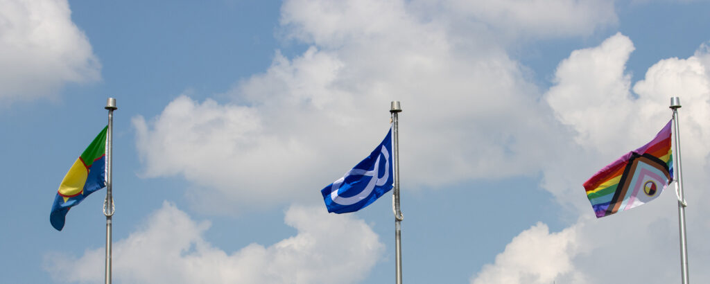 去年六月,e8体育 的个性化骄傲旗帜与条约一国旗帜和红河梅蒂斯旗帜一起升起位于圣母院e8体育网的公交环线入口处,作为团结、自豪和包容性的象征。这些旗帜全年飘扬,每天提醒我们对公平、多样性和包容性的共同承诺,并在我们所做的一切事情中践行真相与和解。