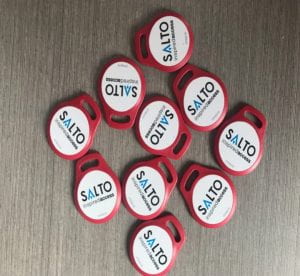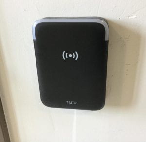 将密钥卡上有 SALTO 贴纸的一侧对准走廊锁上的读卡器。当灯亮时绿色门未锁。
