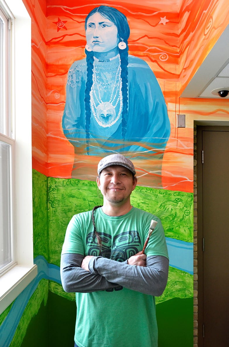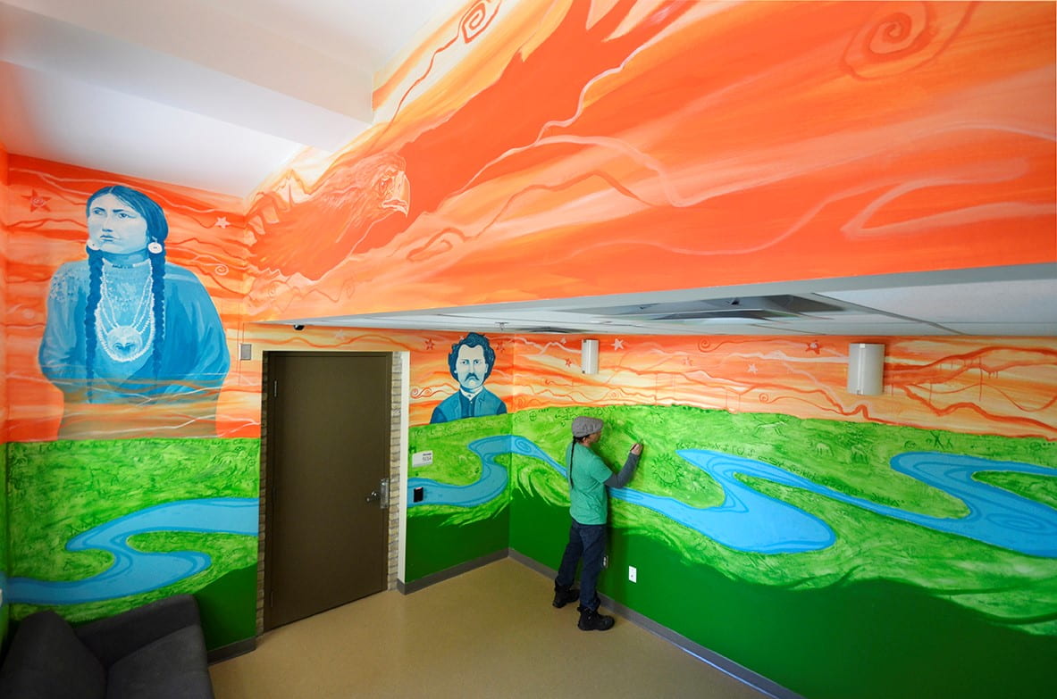 布朗格画了三幅肖像,以便学生在艺术作品中看到自己。其中有一名男性战士、一名女性(灵感来自埃尔维斯·普雷斯利 (Elvis Presley) 的切诺基曾曾祖母晨鸽·怀特 (Morning Dove White) 的照片)和路易斯·瑞尔 (Louis Riel),以向马尼托巴省梅蒂斯人的历史致敬。就连布朗格的小女儿也参与了这幅壁画的绘制,这是他发起的一项持续的传统,这样她们就可以看到自己的礼物被分享。