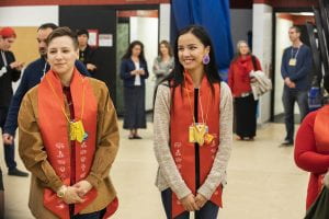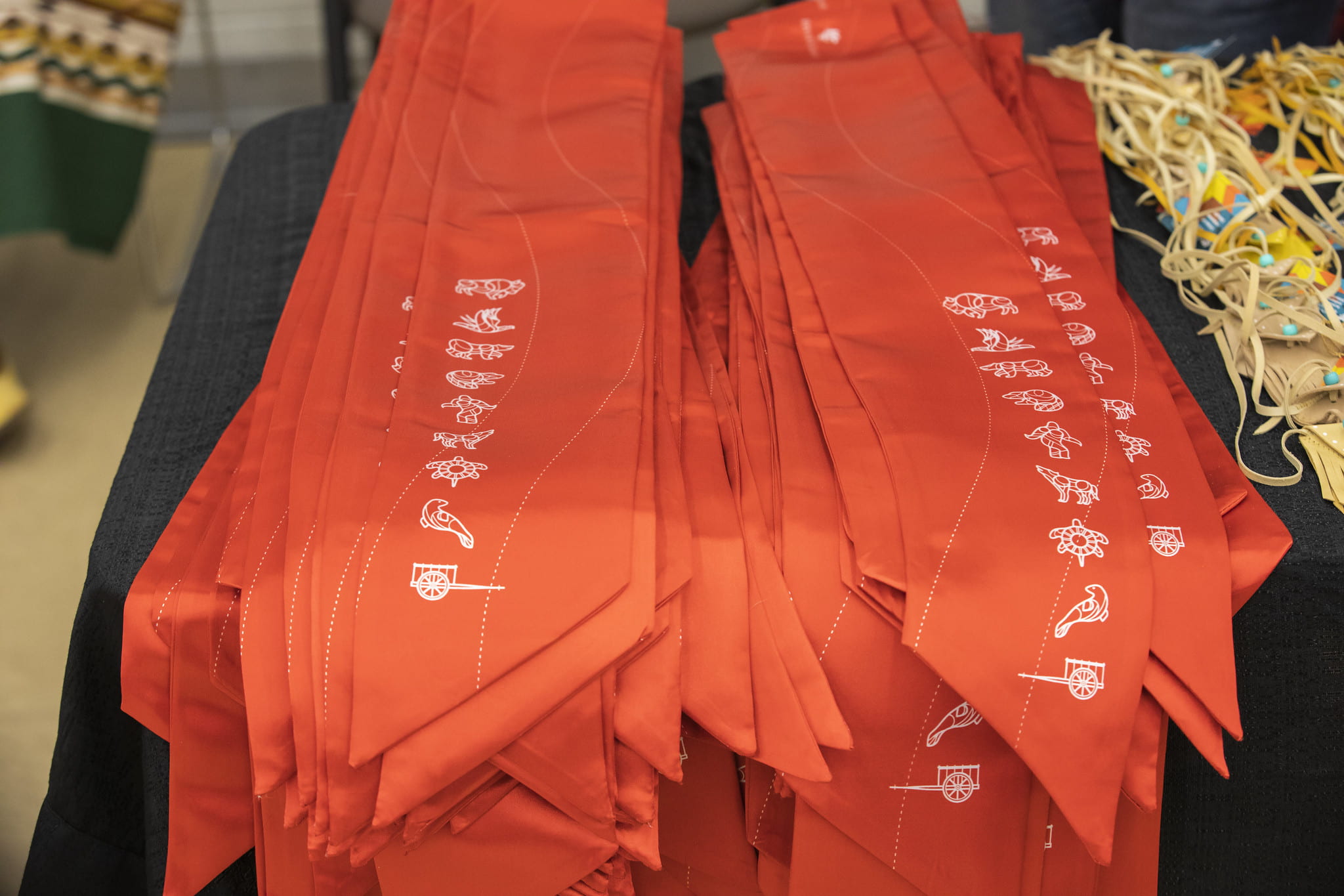 圣肩的设计带有代表七大神圣教义、梅蒂斯文化和因纽特文化的符号。披肩的中间是红河学院的标志,位于颈后。阿西尼博因河和红河也贯穿整个设计,它铺在红色丝绸上,自豪地展示了学院的品牌颜色。