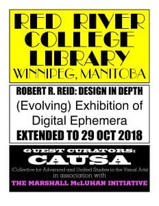 由 CAUSA(视觉艺术高级统一研究集体)与马歇尔·麦克卢汉倡议联合主办的“罗伯特·R·里德:深度设计”展览展示了大量(经过精心挑选的)跨文化和跨代际的文学/哲学文本集合(包括从中文、法文、德文、意大利文、日文、韩文和威尔士语)。红河学院图书馆项目的“间歇性出现”内容包括警句和启示性引文(从公元前 5 世纪到 2018 年),由 CAUSA 研究策展人选择并由 Robert R. Reid 进行印刷设计。