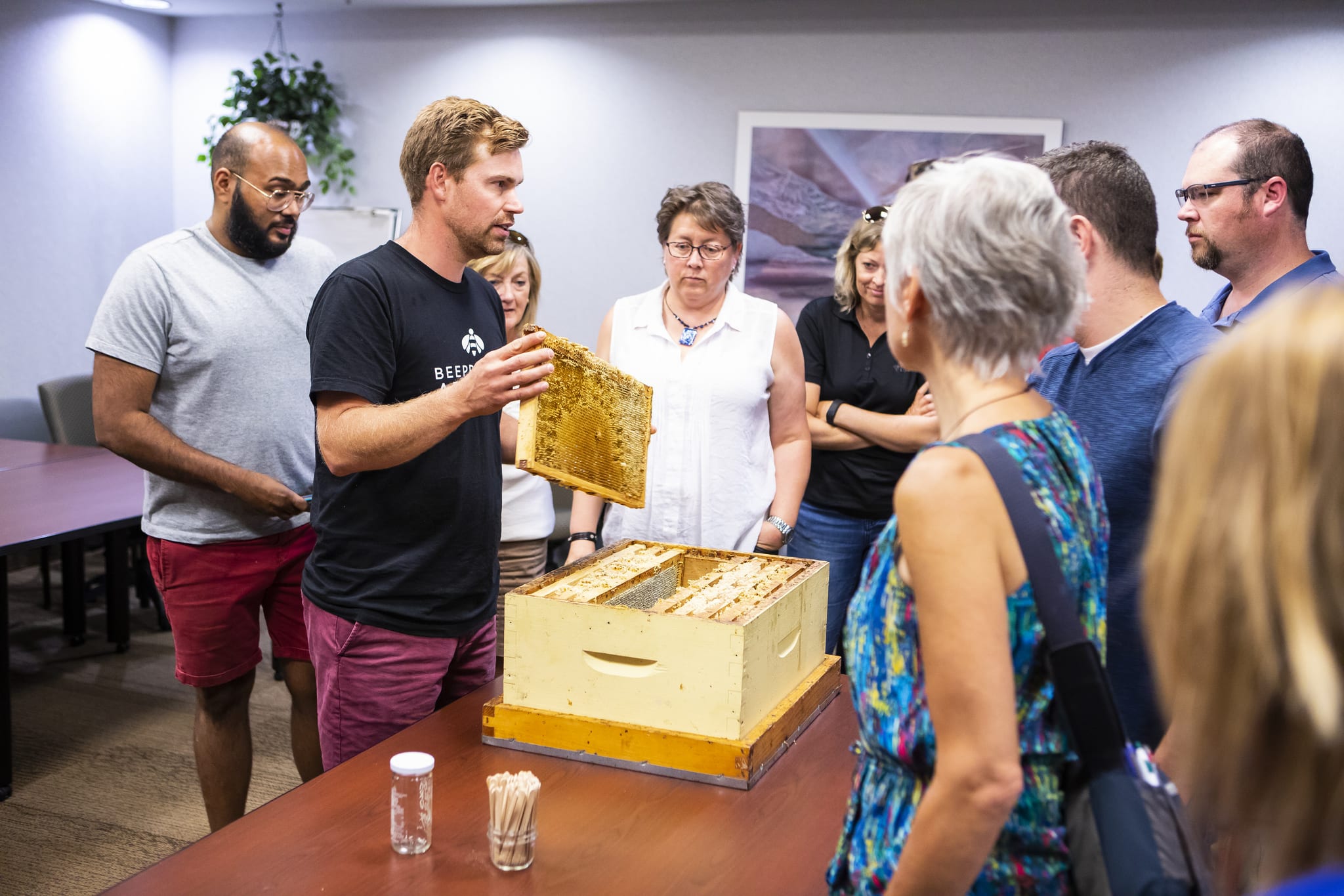 从2016年开始,当时我们4号安装了三个蜂箱 市中心 e8体育网帕特森全球食品研究所 (PGI) 的地板露台。整个夏天,学生和工作人员都可以与养蜂人一起参观蜜蜂,并参加蜂蜜提取等研讨会。生产的蜂蜜以隔壁公园的名字命名为“Bijou”,并于 2016 年 9 月在我们首个e8体育 农贸市场售出(售完)。