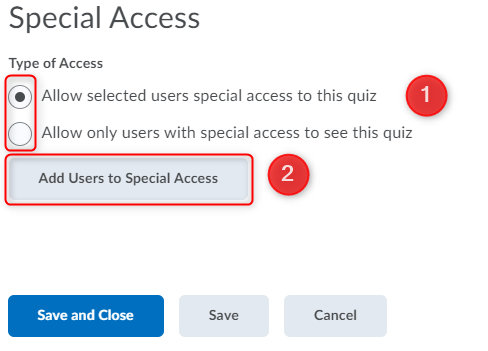1. 限制标签,在特殊访问权限区域,选择以下选项之一 (1):允许选定的用户对此测验有特殊访问权限