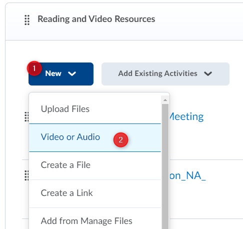在内容工具中,点击新 (1)然后选择视频或音频 (2)选项。
