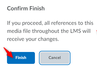 系统会要求您确认更新视频的决定,提醒您更新将影响该文件在 Brightspace 中所有位置的所有实例。单击“完成”继续。