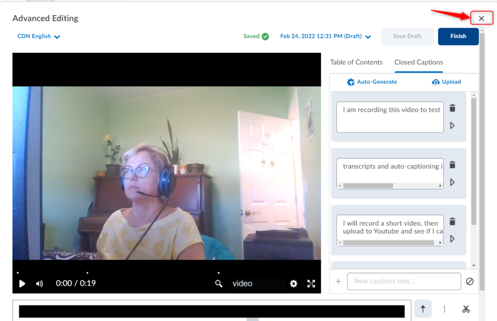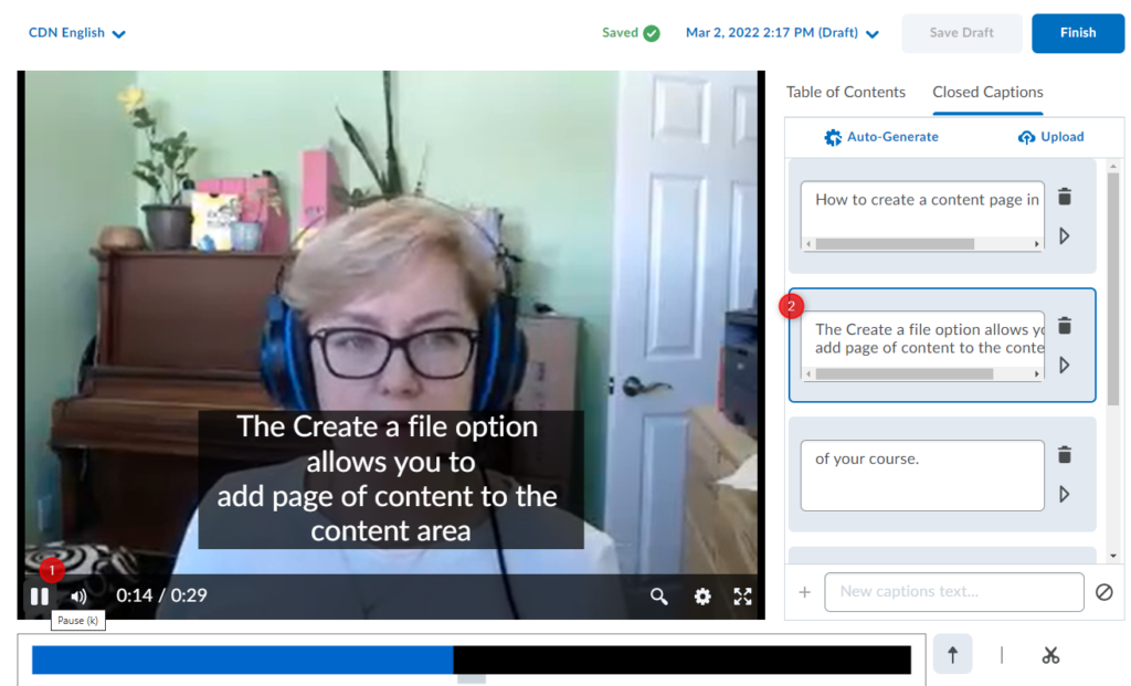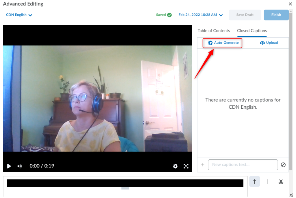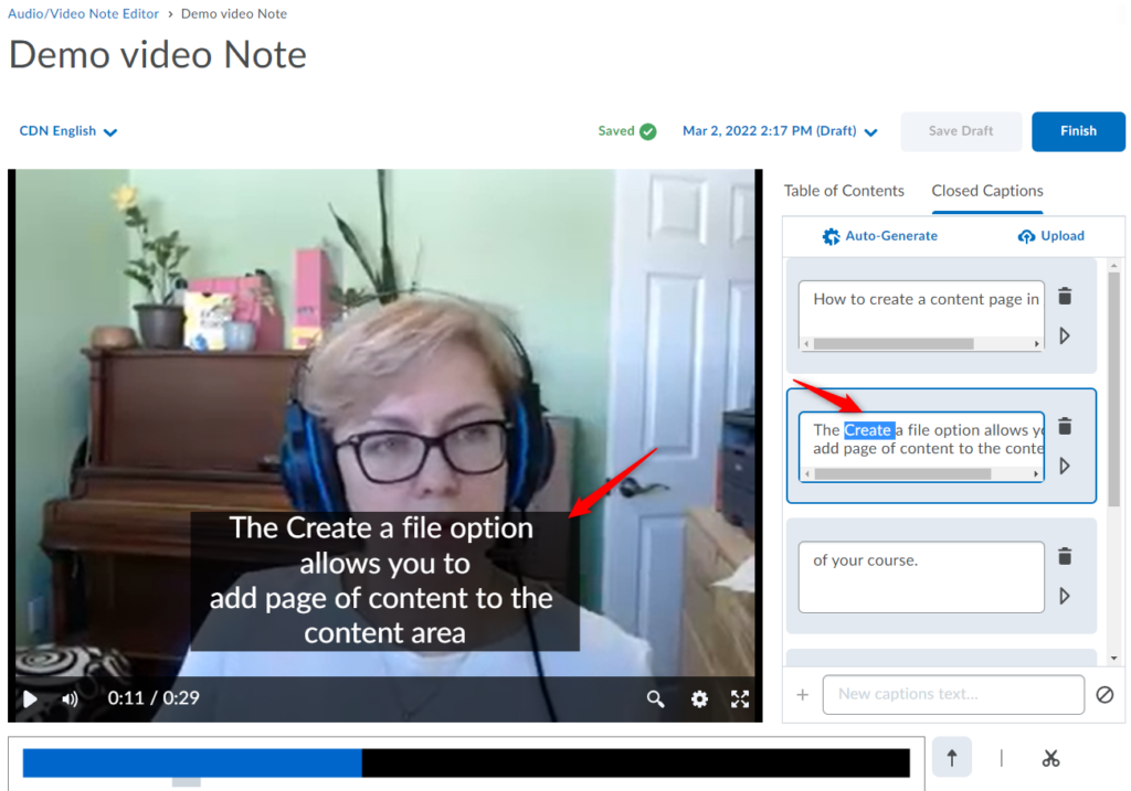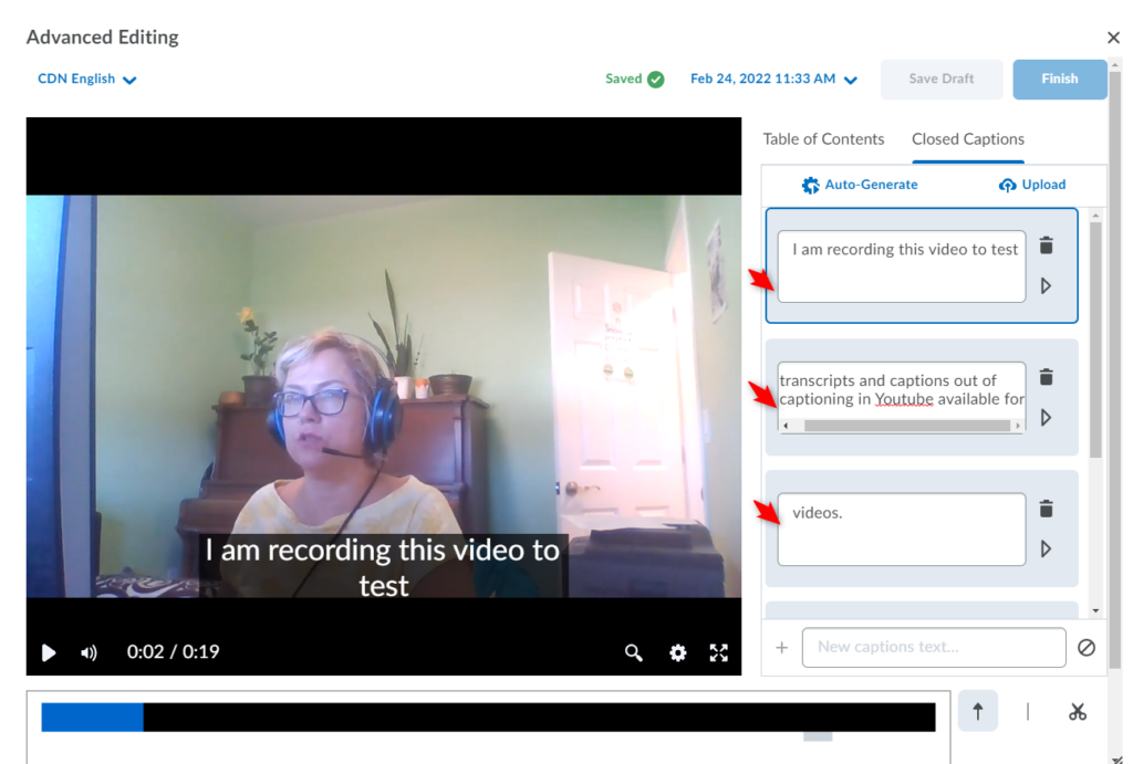 重要:与任何自动生成的字幕一样,您应该验证字幕的准确性。 在您修改/编辑隐藏式字幕中的至少一个文字之前,您将无法继续保存/完成视频, 即使您发现字幕准确。为此,只需单击/突出显示该单词,删除然后重新输入即可。更新后的字幕将立即出现在您的视频预览中。您还可以向现有部分添加新标题。 另存为草稿和完成 按钮将变为活动状态,因此您可以继续使用更新的隐藏式字幕保存视频。