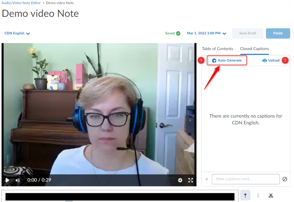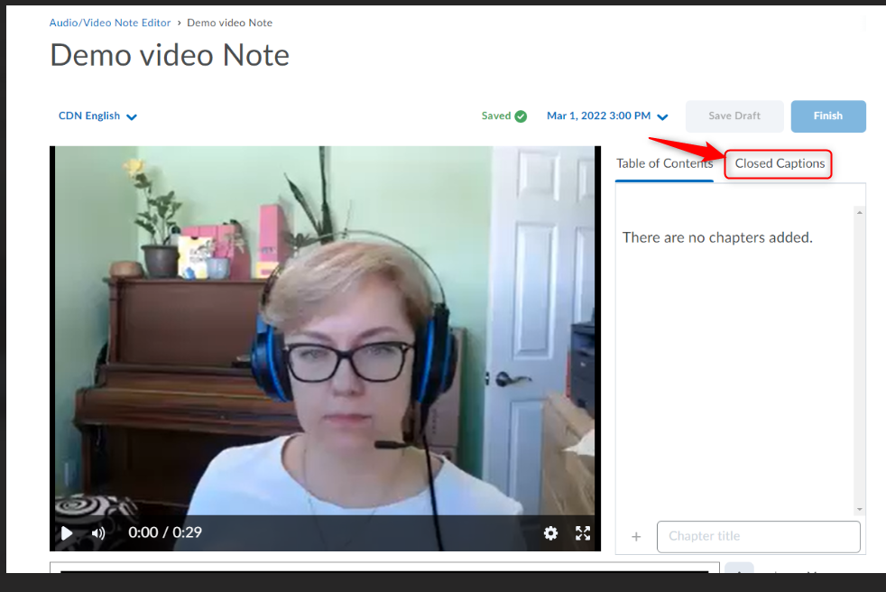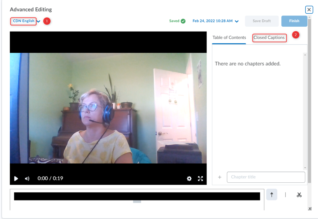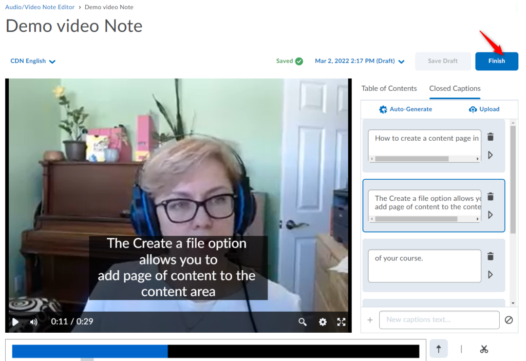重要:与任何自动生成的字幕一样,您应该验证字幕的准确性。 在您修改/编辑隐藏式字幕中的至少一个文字之前,您将无法继续保存/完成视频, 即使您发现字幕准确。为此,只需单击/突出显示该单词,删除然后重新输入即可。更新后的字幕将立即出现在您的视频预览中。您还可以向现有部分添加新标题。 另存为草稿和完成 按钮将变为活动状态,因此您可以继续使用更新的隐藏式字幕保存视频。