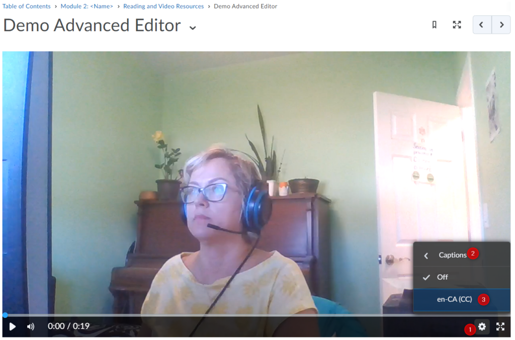 要在视频中启用字幕,请点击齿轮(设置)(1),然后点击字幕(2) 并选择抄送 (3).
