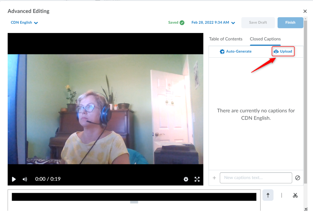 如果您想从文件(.vtt 或 .srt 文件)上传并修改您自己的隐藏式字幕,请按照隐藏式字幕的步骤 1-6 操作:自动生成,然后点击上传在“隐藏式字幕”标签下,导航到计算机上的字幕文件。