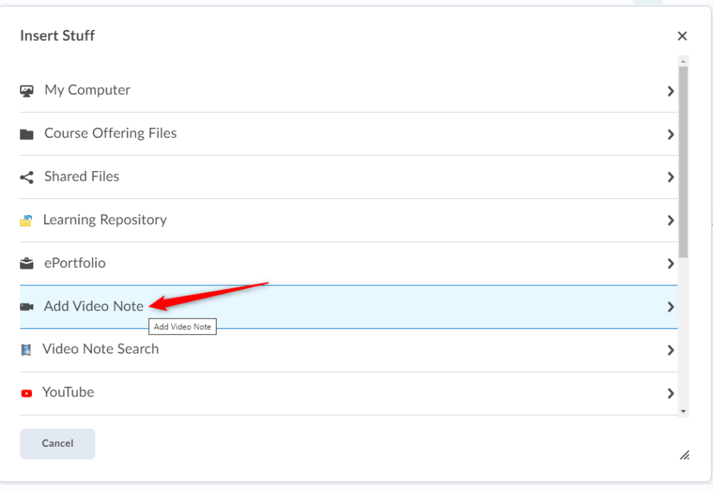 选择添加视频注释来自 Brightspace 编辑器/HTML 编辑器中的“插入内容”选项。