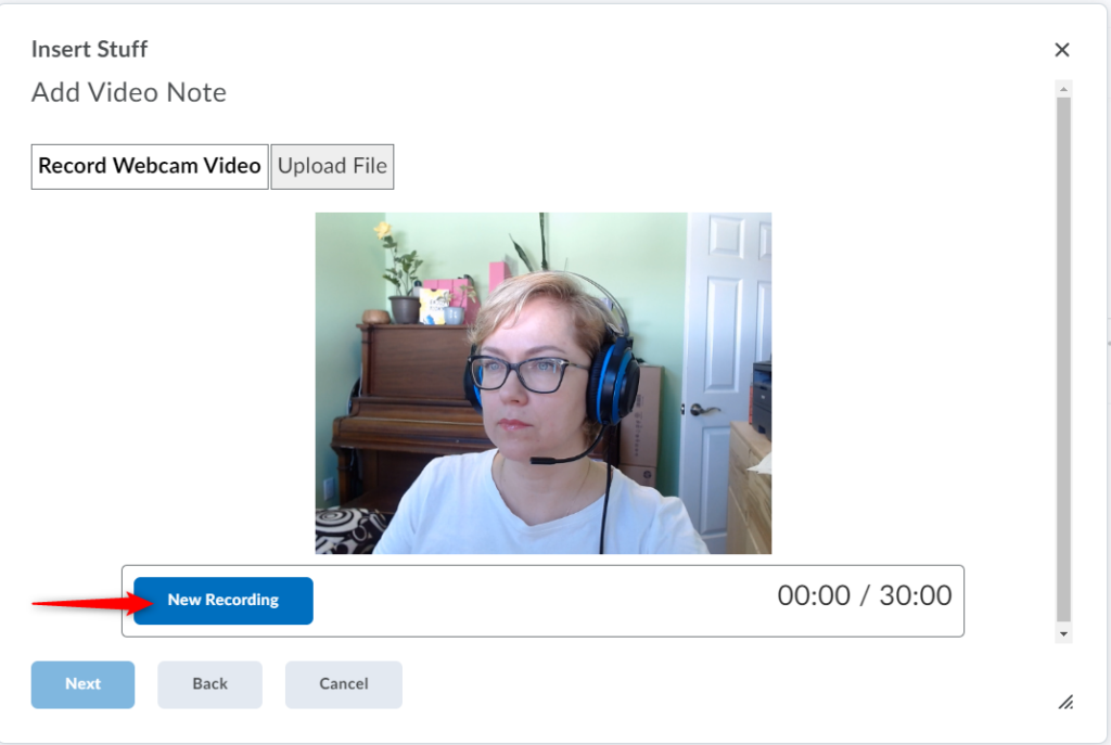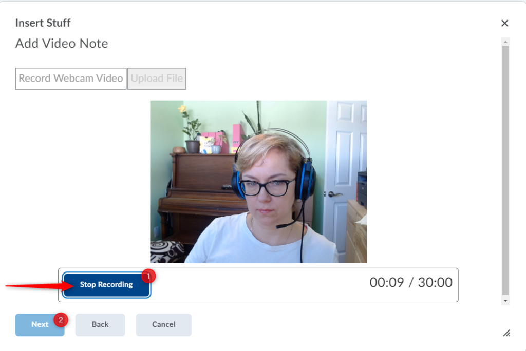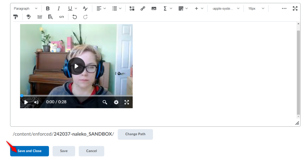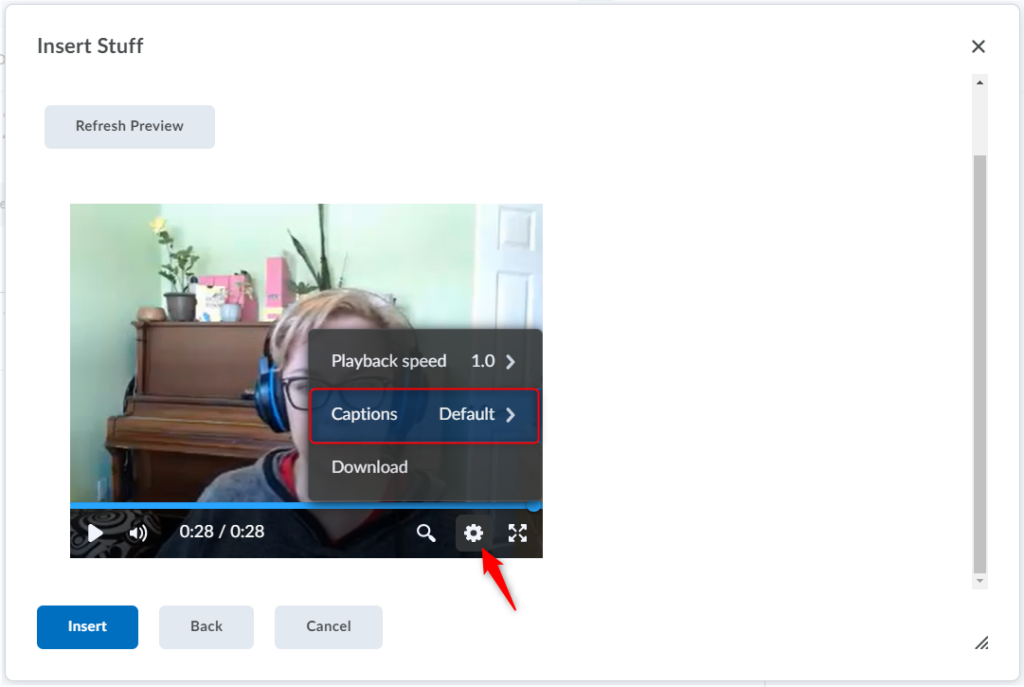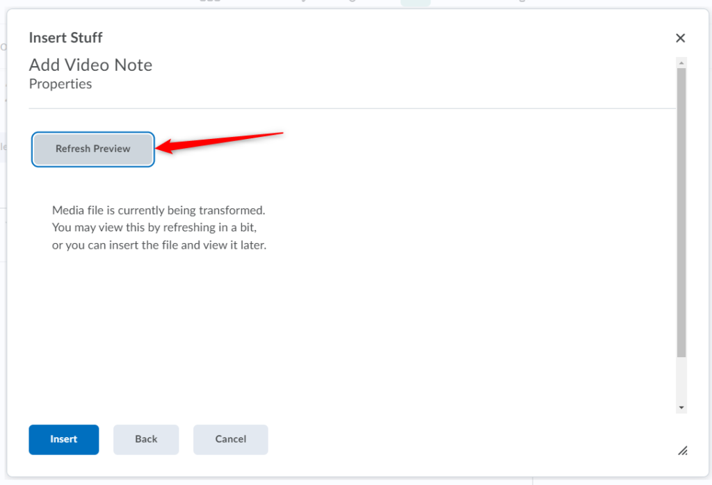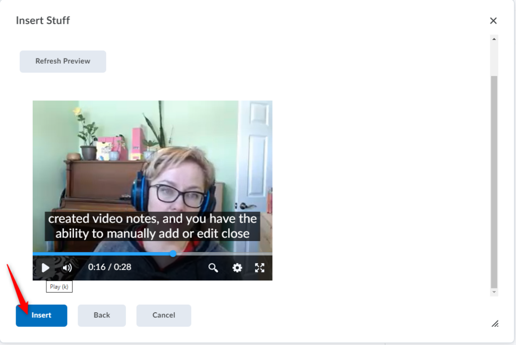 预览视频笔记后,点击插入将您的视频笔记添加到 Brightspace 编辑器。