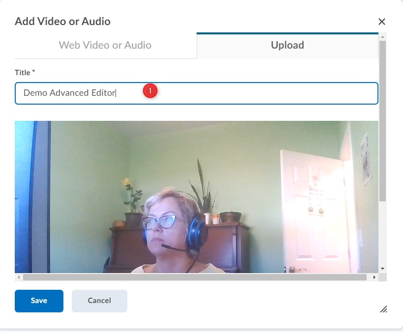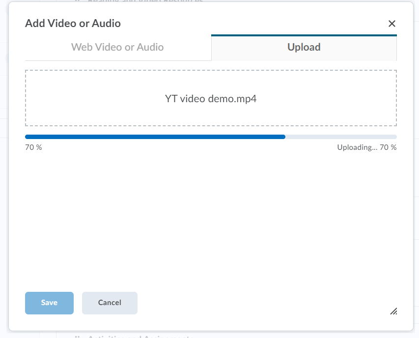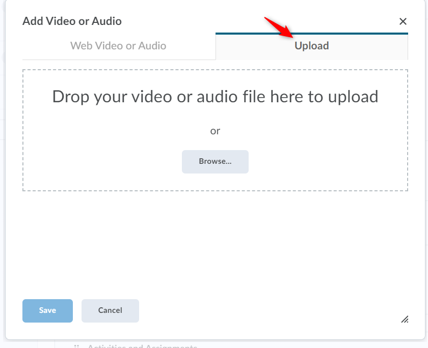 在添加视频或音频窗口,选择上传选项卡。您可以使用浏览或将视频文件拖到上传空间。
