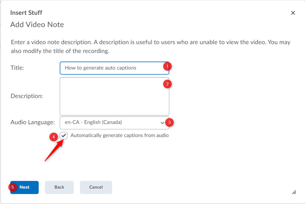 输入视频注释的标题 (1) 和说明 (2)。选择音频语言 (3) 并选中“自动从音频生成字幕”框 (4)。点击下一页(5) 继续。