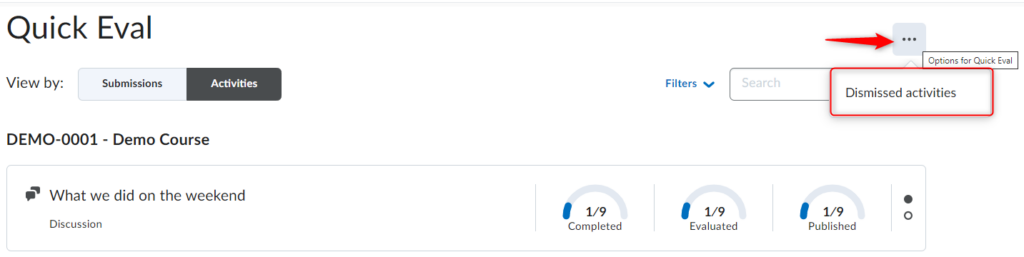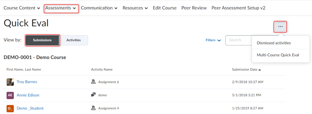 从特定课程访问E8体育比分时,您将看到与该课程相关的所有要评估的活动的列表。点击省略号图标并选择多课程E8体育比分 查看所有可用课程的提交内容。