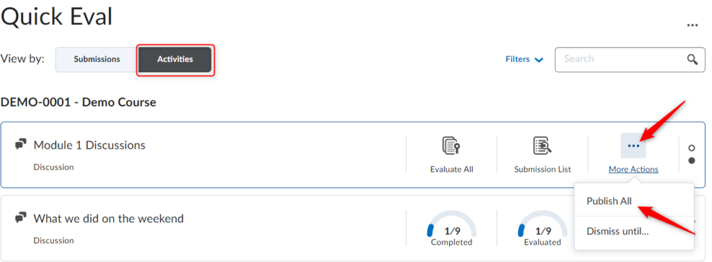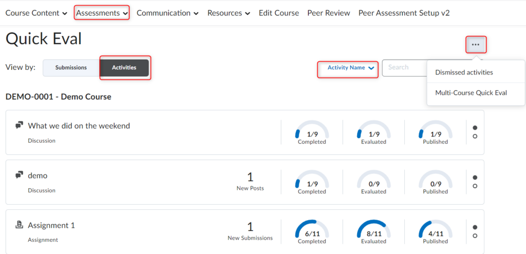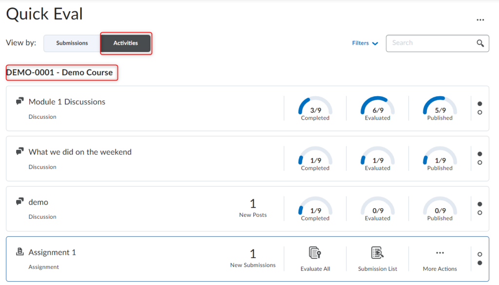 活动视图会显示一些指示器,以显示学习者提交进度、教师评估进度以及向学习者发布反馈的进度。它还包括评估页面、提交页面的链接,以及同时发布所有评估的“全部发布”操作。此视图对于评估特定作业、测验或讨论的所有作业非常有用。