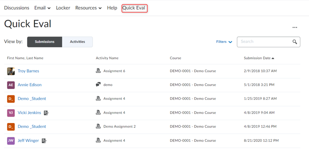 提交视图显示需要在教师的所有课程中评分的所有学习者提交内容的列表。在成绩发布之前,评估仍然可见。