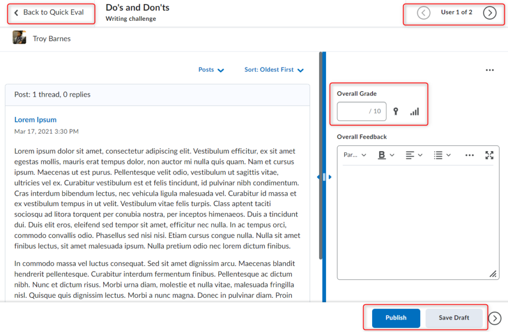 当讨论 选择提交后,评估员将被带到讨论评估 屏幕。像平常一样对帖子进行审核和评分。