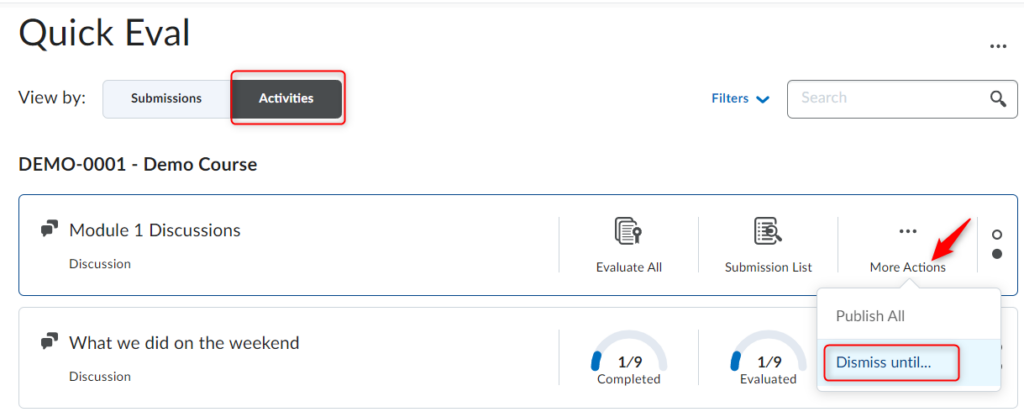 您可以通过E8体育比分来评估学习者提交的内容提交或活动 看法。在“提交”视图中,您可以对个别学生进行评分,在“活动”视图中,您可以评估特定作业、测验或讨论的所有新提交内容。