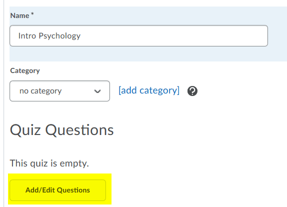 为您的测验命名,然后点击“添加/编辑问题”注意:本指南使用“新”测验构建体验。