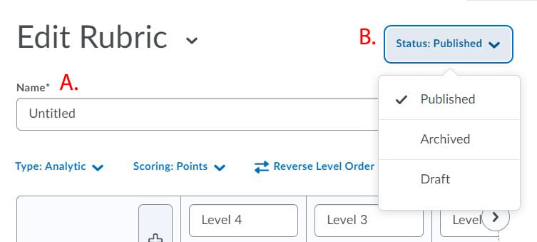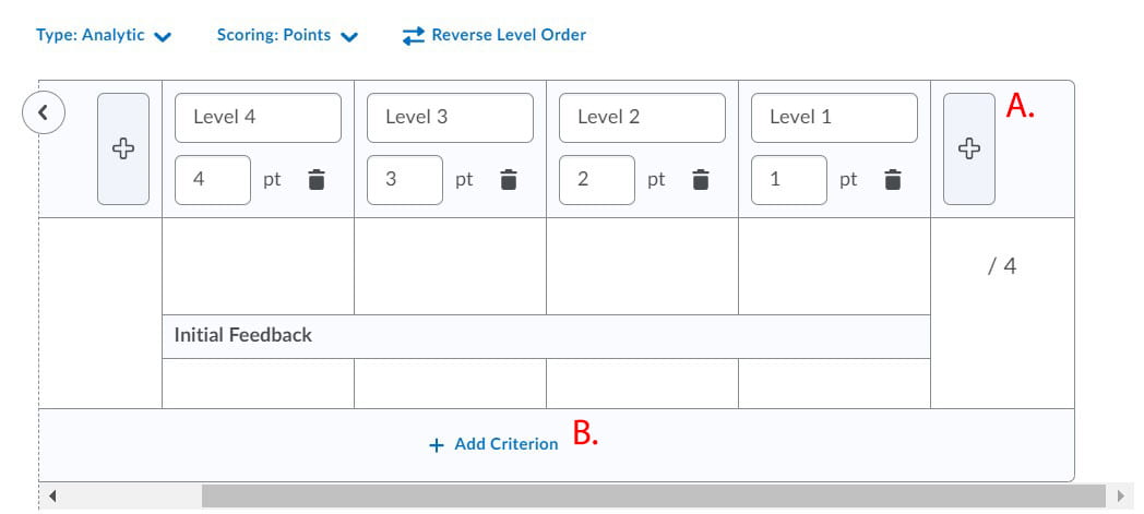 7。通过点击“+”图标添加 (A) 或点击垃圾桶图标删除来设置级别数量(例如:低于平均水平、平均水平和高于平均水平为 3 个级别),以及您将使用的条件数量 (B)。 将级别和标准重命名为有意义的名称。