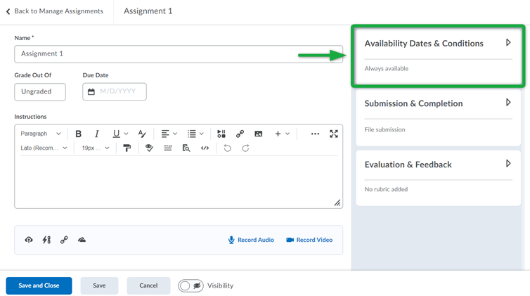 在“可用日期和条件”选项下,您可以进行设置开始和结束日期, 发布条件,并提供特殊访问权限致一些学生。