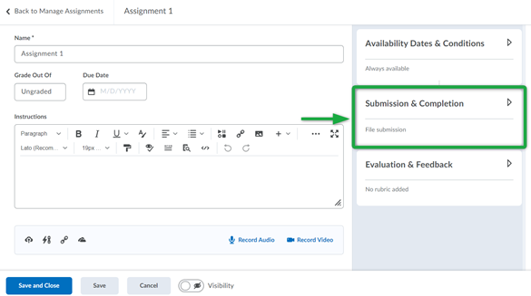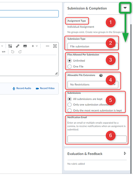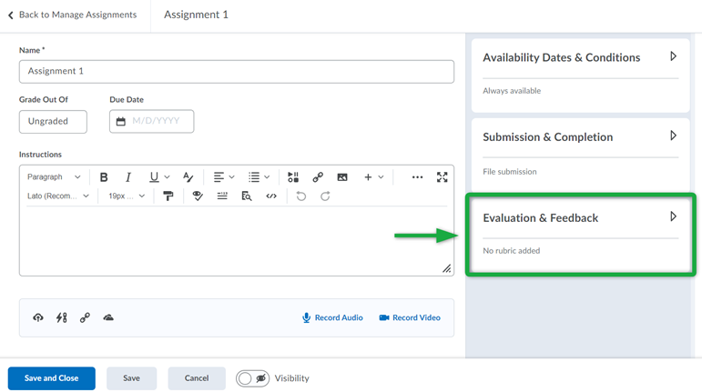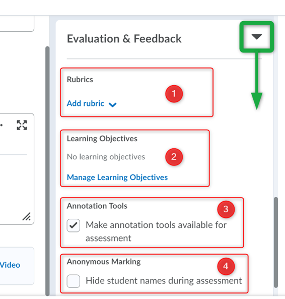 在“评估和反馈”选项下,您可以进行设置评分细则, 学习目标, 注释工具,并且匿名标记.