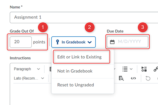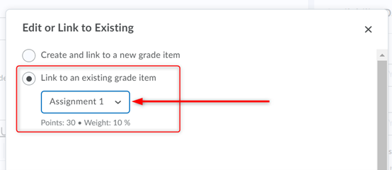 要将作业与成绩簿中的成绩项关联起来,请选择一个编辑或链接到现有选项,及下链接到现有成绩项目选择正确的成绩项目。