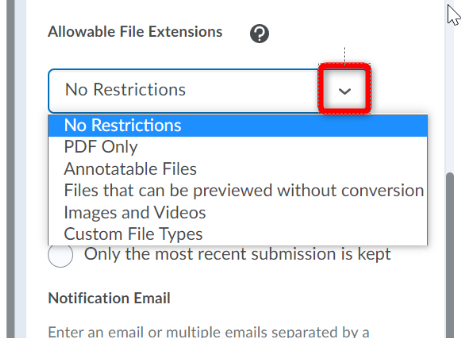 允许的文件扩展名:允许的文件扩展名字段提供了学习者可以为作业提交的文件类型的选项。下拉菜单中的选项包括:
