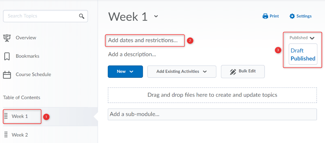 4。点击“旁边的下拉菜单已发布” (3) 可以改为“草稿”如果您不希望学生看到其中的模块和内容。